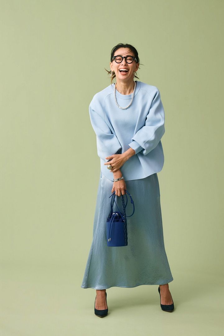 ニット¥9,900(ステートオブマインド/ゲストリスト)サテンスカート¥26,400(yori)バッグ¥163,900(セルジオ ロッシ/セルジオ ロッシ カスタマーセンター)パンプス¥17,600(ダイアナ/ダイアナ 銀座本店)メガネ¥47,300(モスコット/モスコット トウキョウ)ネックレス¥58,080(ペヨテ・バード・デザイン/ZUTTOHOLIC)リング¥8,640バングル¥8,640(ともにアビステ)
