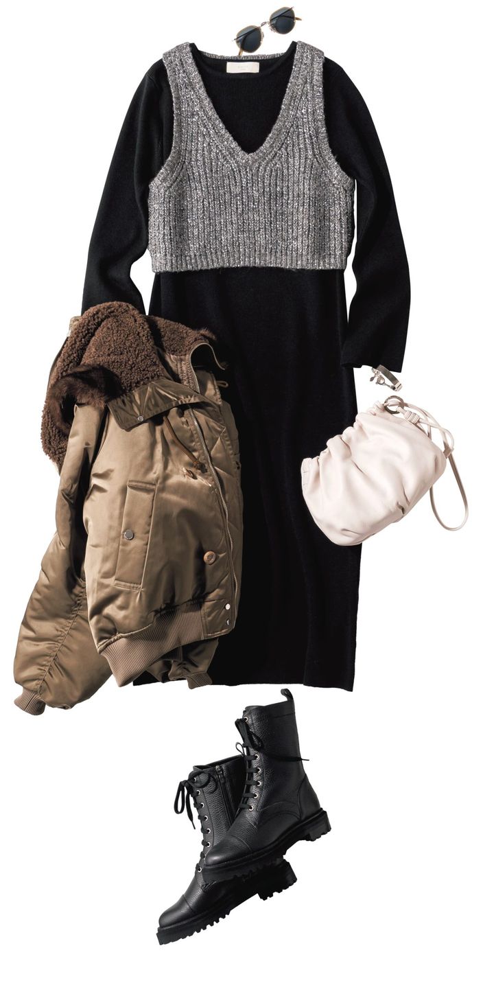 カジュアル合わせがフリルの可愛さを存分に引き立てる。ラメのビスチェがニットワンピの目線を上げてスタイルアップにも効果的。単体でも着回せるラメビスチェとのドッキングすることで快適さとオシャレを両立。ブルゾンとハイカットブーツで、ワイルドなアクセントを加えたバランスの取れたスタイルに仕上がります。