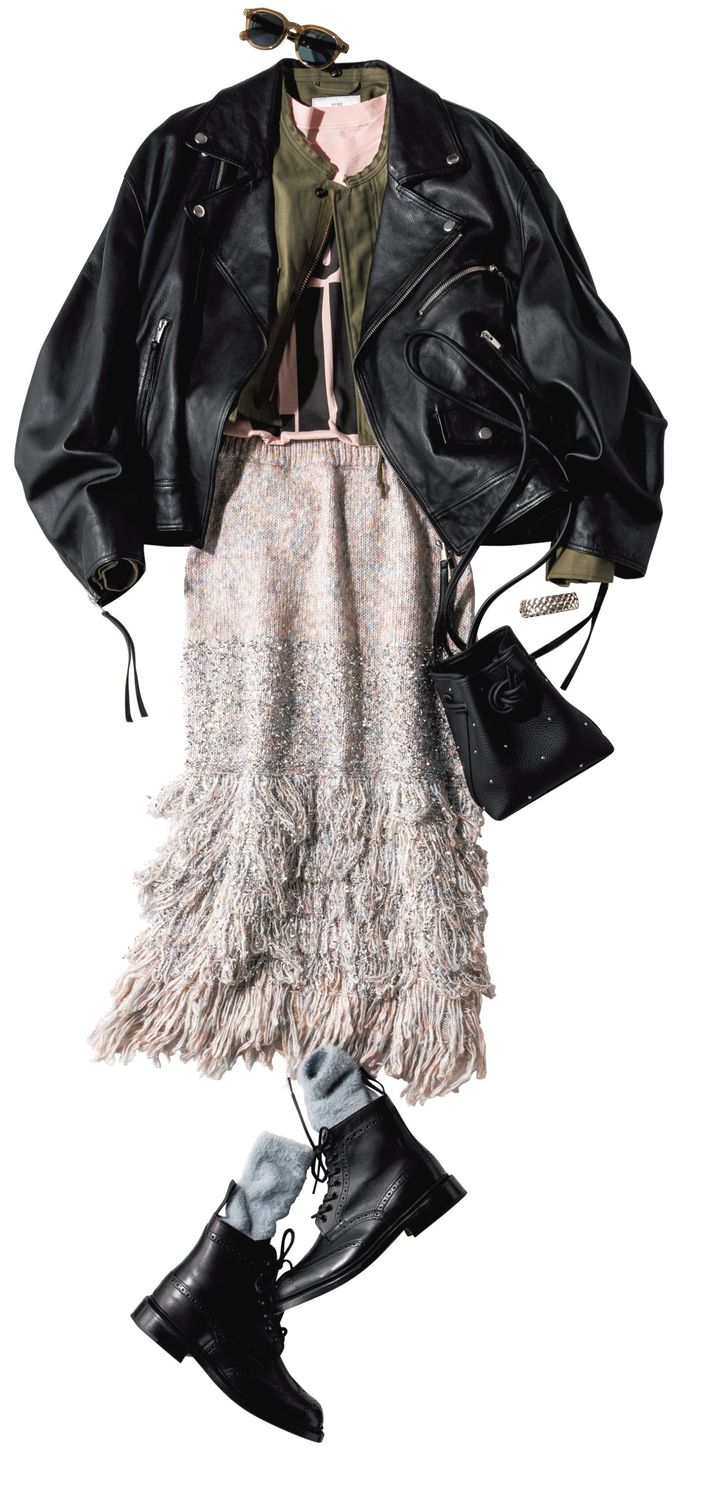 スカート¥22,000(ジユウバイラベルエチュード)ライダースジャケット¥41,800(メゾンスペシャル/メゾンスペシャル 青山店)ミリタリージャケット¥41,800(ハイク/ボウルズ)Tシャツ¥15,400(THIRD MAGAZINE×KATHARINE HAMNETT/THIRD MAGAZINE)バッグ¥47,300(ヴァジック/ヴァジックジャパン)ブーツ¥132,000(トリッカーズ/トリッカーズ 青山)ソックス¥1,200(バナナ・リパブリック)サングラス¥47,300(アイヴァン/アイヴァン 東京ギャラリー)ブレスレット※店舗限定¥30,800(フィリップ オーディベール/アンタイトル)