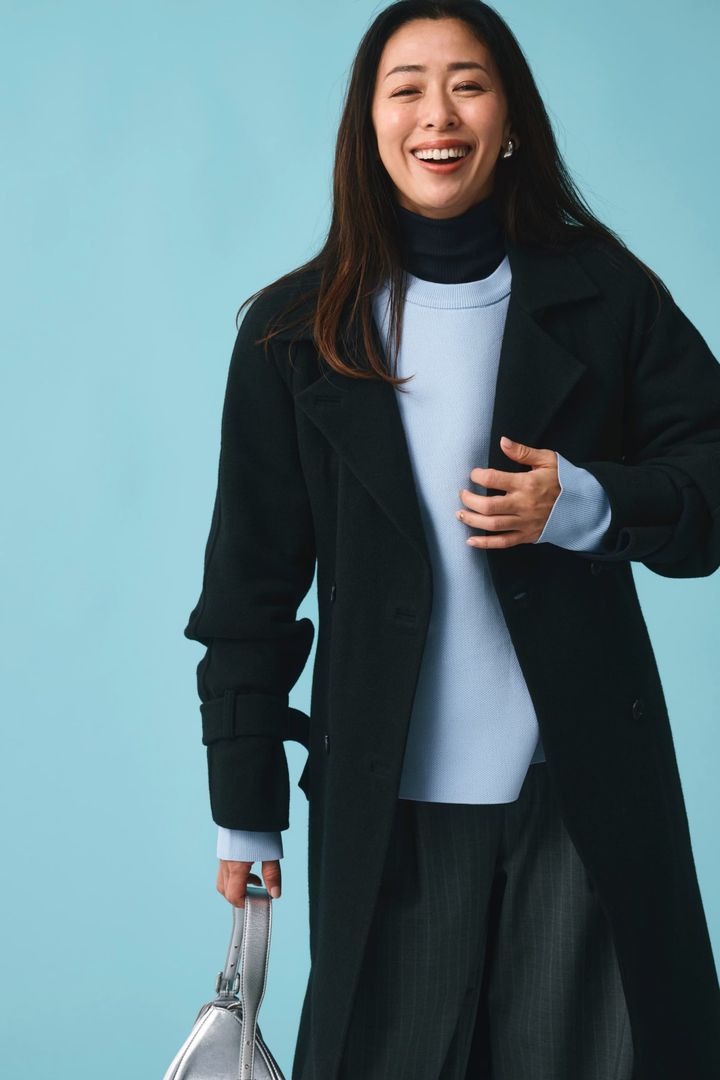 ニット(着回し)ブラックコート¥330,000(サヴィル サヴィ)タートルニット¥12,100(MIESROHE/MIESROHE ルミネ新宿1店)パンツ¥44,000(ソブ/フィルム)フリンジバッグ¥205,700(J&M デヴィッドソン/J&M デヴィッドソン カスタマーセンター)イヤリング¥6,300(アビステ)