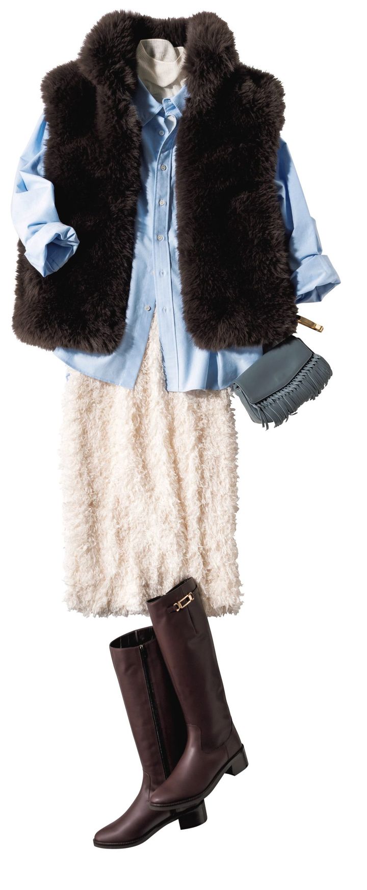白スカートはシンプルにまとめるよりレイヤードでコーデに立体感をプラス。ファーベスト合わせはシャツのレイヤードでヘルシーな華やかさを漂わせて。ロングブーツで防寒もカバーしつつ、シーズン感もしっかり取り入れたスタイルに。