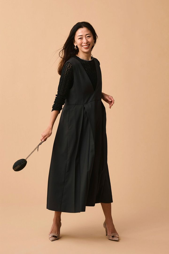 ジャンパースカート¥39,600(マルティニーク/マルティニーク ルミネ横浜)シアトップス¥15,400(アルページュストーリー/アルページュストーリー プレスルーム)バッグ¥46,200(マリア・ラ・ローザ/ルル・ウィルビー/アルアバイル)パンプス¥130,900(セルジオ ロッシ/セルジオ ロッシ カスタマーサービス)コンビフープピアス¥9,900(アビステ)チョーカー¥29,810(エムシー・スタジオ/ZUTTOHOLIC)