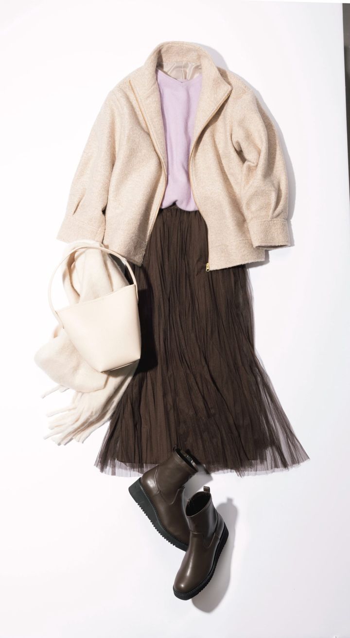 スタンドカラーコート¥16,500 ニット¥10,450 チュールスカート¥8,800 バッグ¥6,050 厚底ブーツ¥9,900 ストール¥3,850 ゴールドネックレス、リボンピアス※参考商品(すべてエルーラ/アダストリア)