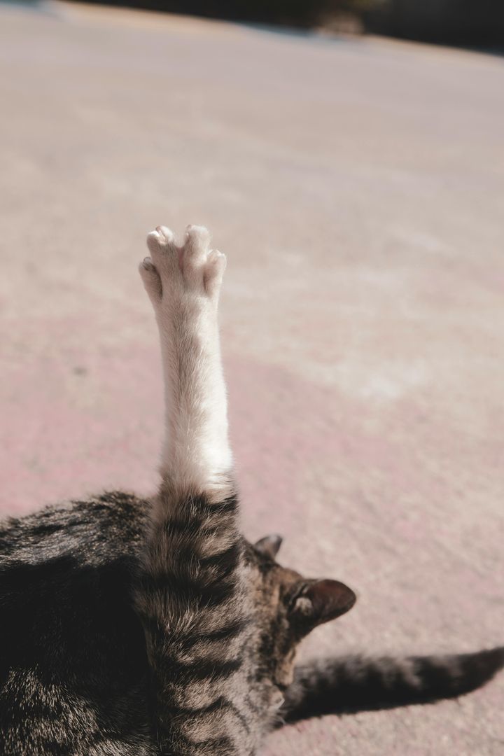 本日の顔がなくとも美人猫は、お尻付近の毛づくろい真っ最中のトラ猫さん。以前流行った黄門様日光浴かもしれません。きのこのような、ツクシのような、はたまたちょっと細身のふきのとうのような。猫の指の股に指を入れてコネコネしたくなる美しいフォルムであります。
