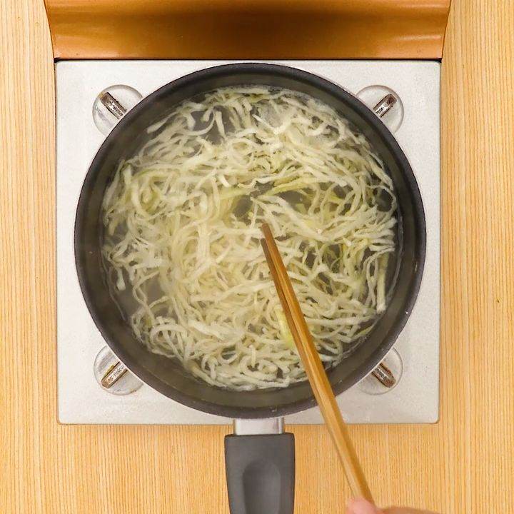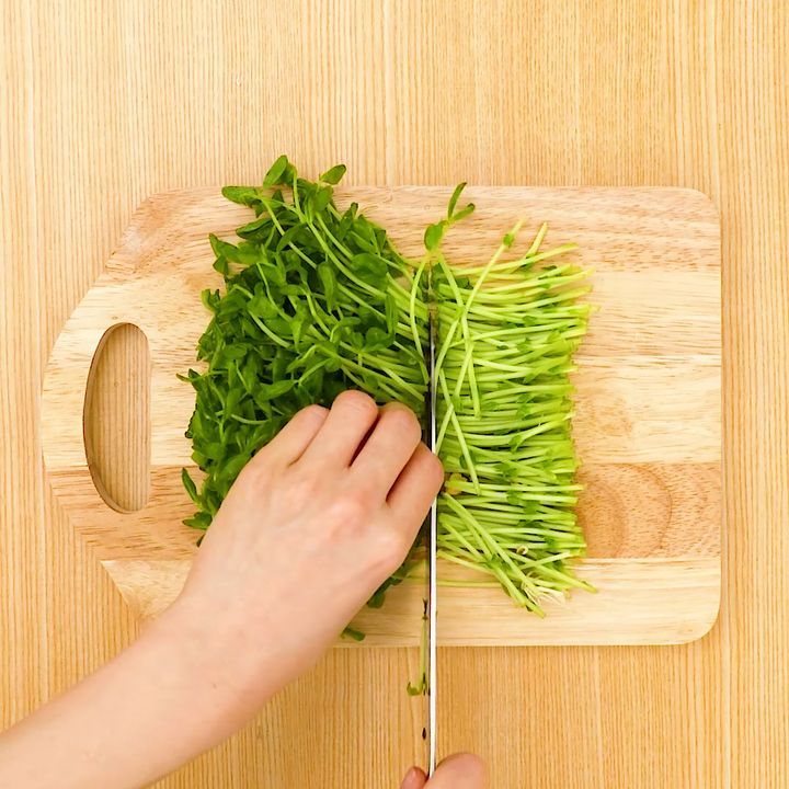 2.鍋に湯をわかして、豆苗を入れて30秒程さっとゆでて、豆苗を取り出して水気を切る。(湯は捨てない)切り干し大根を入れて4〜5分ほど中火でゆでる。湯を切り粗熱がとれたら水気をしぼり、食べやすい大きさに切る。