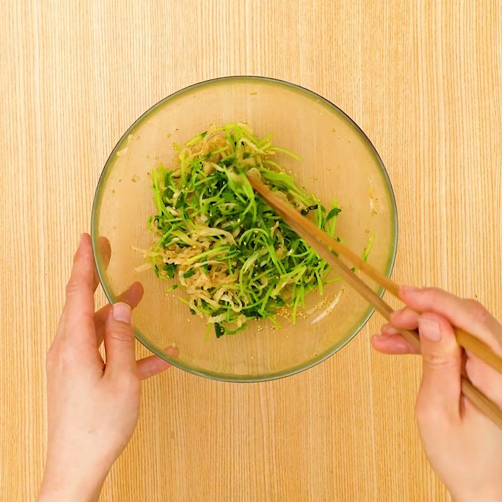 3.ボウルに☆を入れて混ぜ、豆苗、切り干し大根を入れて混ぜ合わせる。