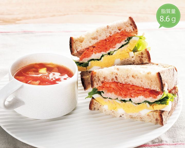 こんなボリューミーなサンドイッチも立派なダイエットフードなんです!ツナ&卵でたんぱく質もしっかり、キャロットラぺで緑黄色野菜も摂取。