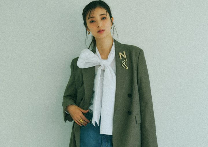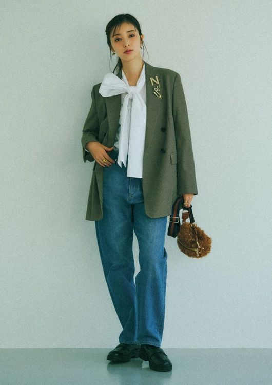 ジャケット¥15,990/アンフィーロ、ブラウス¥16,940/#Newans(ともにオンワード樫山) デニムパンツ¥9,900、ブローチ[上]¥2,420、ブローチ[下]¥2,420/以上シップス エニィ(シップス) イヤリング¥5,280/フェリーチェ、リング[左手]¥16,400/miyunakamura、リング[右手]¥3,990/soie(以上ロードス) バッグ¥4,620/アコモデ(ACCOMMODEルミネエスト新宿店) ローファー¥41,800/ファビオ ルスコーニ(エリオポール代官山)