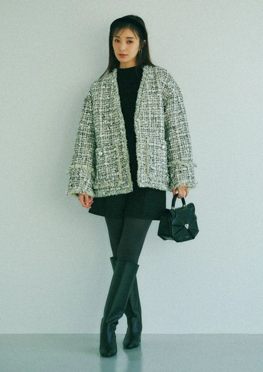 ツイードジャケット¥39,600/アルページュストーリー ニット¥5,390/リリアン カラット ショートパンツ¥17,600/yori カチューシャ¥20,900/アレクサンドル ドゥ パリ(アレクサンドル ドゥ パリ GINZA SIX店) イヤリング¥3,400/KRONOS(ロードス) タイツ¥1,320/靴下屋(タビオ) バッグ¥79,200/ケイト・スペード ニューヨーク(ケイト・スペード) ブーツ¥38,500/ダイアナ(ダイアナ 銀座本店)