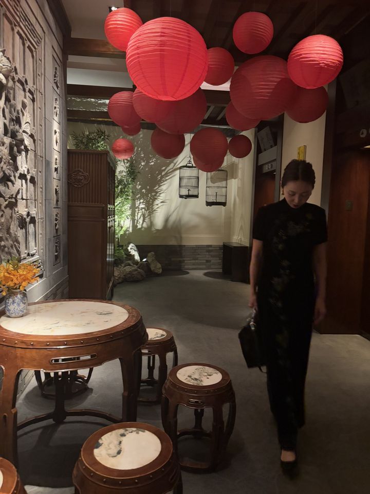 ワンピースと迷いましたがせっかくの機会なので、ヘイフンテラスの空間に合うベロア素材のチャイナドレスをチョイス。ファッションもイベント感覚でとことん楽しむ! これが私のモットーです。