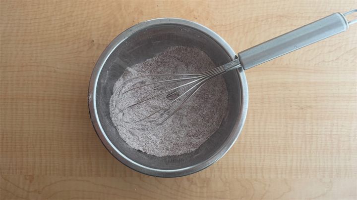 2. 別のボウルに[B]を入れて泡だて器でよく混ぜ、1を入れてシリコンベラで切るように混ぜ合わせる。