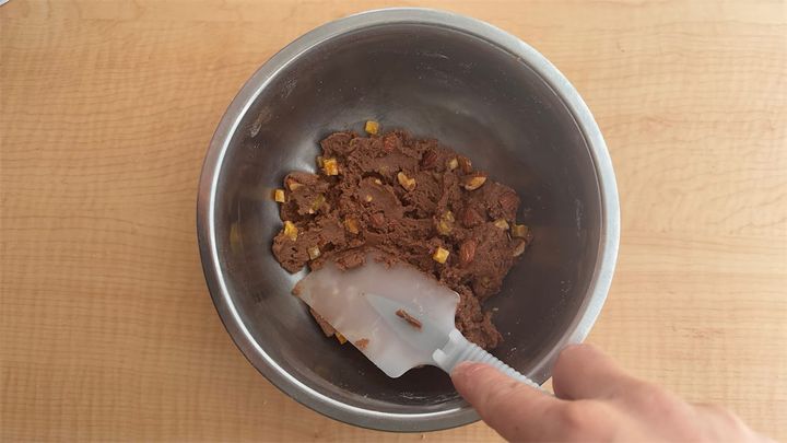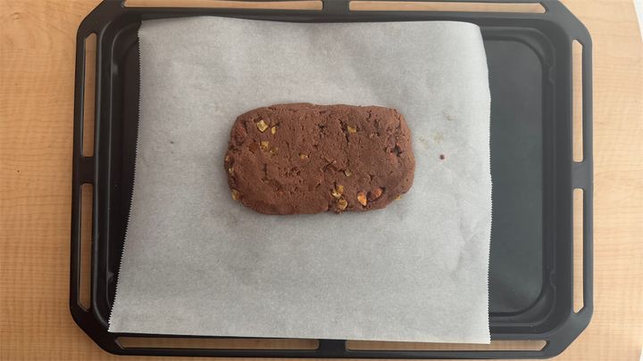 4. 上から手で押さえてひとまとめにし、天板に敷いたオーブンシートの上に生地をのせる。1.5cm厚さの長方形に成形し、180℃のオーブンで20分焼く。