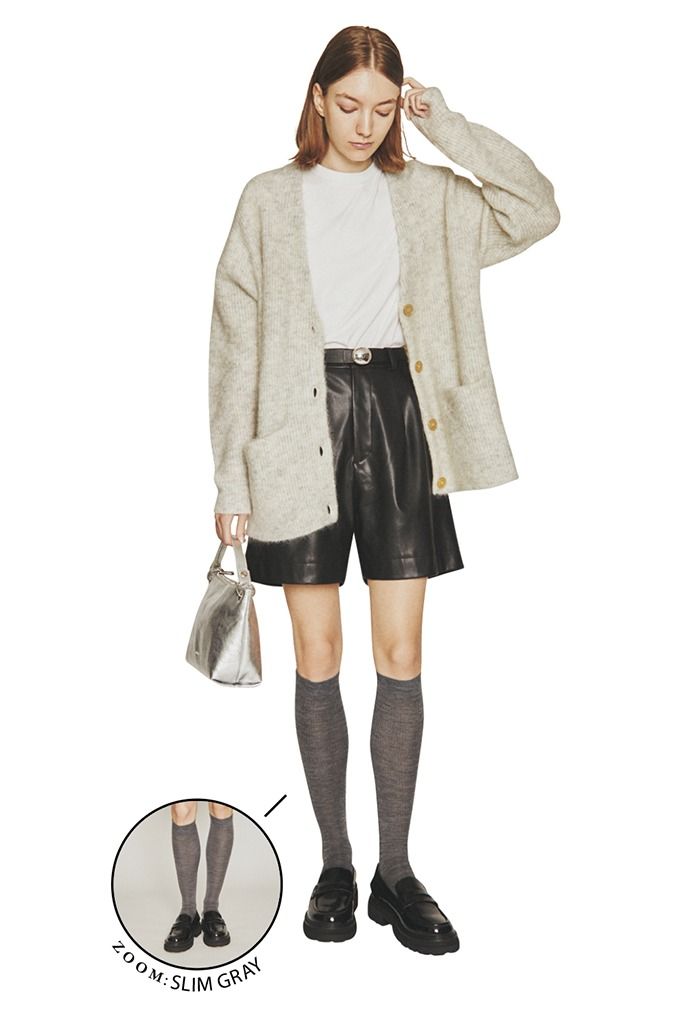 辛口なレザーのショートパンツを引き立てる、ハンサムなグレーソックス。黒だと少し幼く見える、ひざにかかるほどの長さもグレーならすっきり大人っぽく。