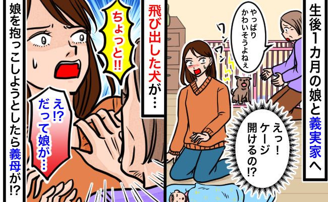 「娘が…」ギャンギャン吠える愛犬をケージから出す義両親。生後1カ月の娘が危ない!焦る私に義母は?
