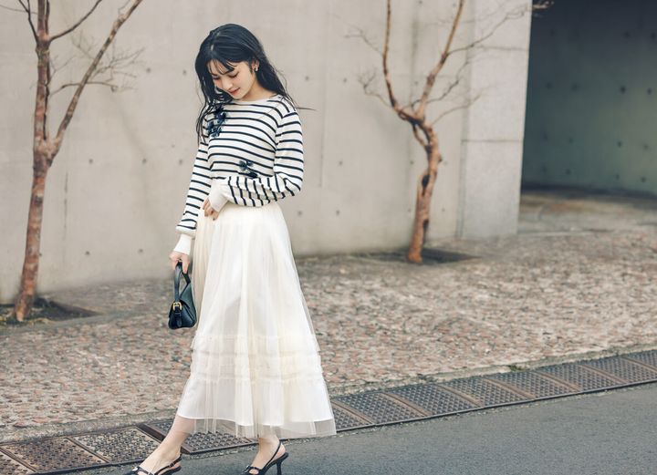 ニットソーとスカートのフィット&フレアシルエットがレディ度満点。モノトーンでまとめてチュールフレアの糖度をオフ。