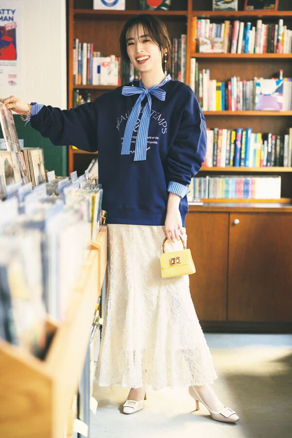 スウェット¥8,910/リリアン カラット ブラウス¥12,100/MilaOwen スカート¥14,300/ココ ディール バッグ¥4,180/burself ピアス¥8,470/エティカ(ズットホリック) ブレスレット¥12,100/サローネ サーティ(14 SHOWROOM) パンプス¥18,700/ダイアナ(ダイアナ 銀座本店)