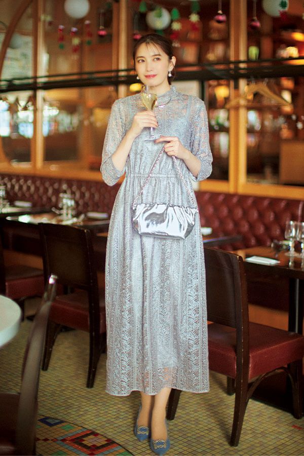 オケージョンシーンでは、ドレッシーな総レースのワンピをチョイス!繊細なレースから透け見えするデコルテがセンシュアルで素敵♡ ウエスト位置高めの切り替えですらっと脚長に。ビジュー付きのパンプス&メタリックのバッグできりっとスパイスをきかせて。