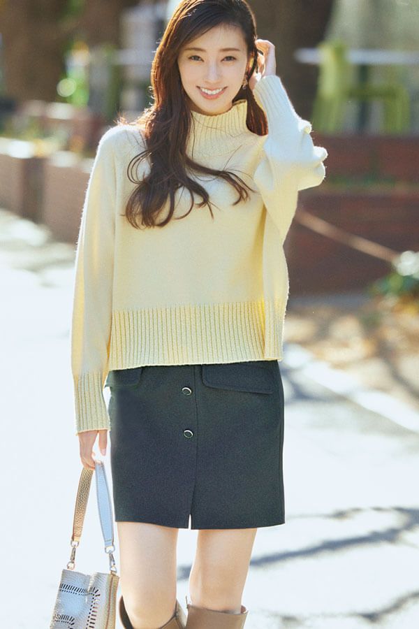 ニット¥4,389/ロペピクニック(ジュンカスタマーセンター) スカート¥11,990/And Couture(And Couture ルミネ新宿店) イヤリング¥12,800/viola(ロードス) バッグ¥59,400/ジャンニキアリーニ(ジャンニ キアリーニ 銀座店) 靴¥38,500/ダイアナ(ダイアナ 銀座本店)
