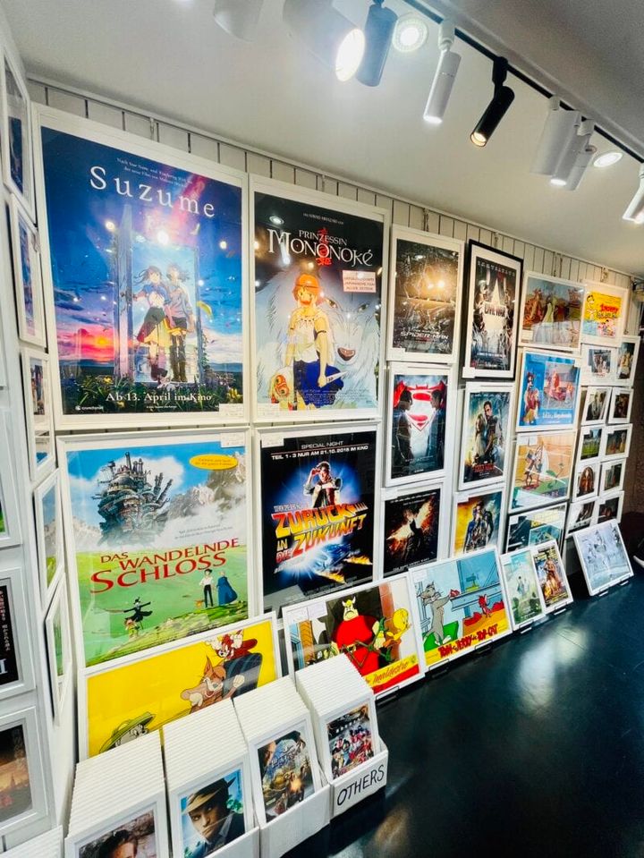 店内にびっしり飾られた映画ポスター。世界で人気を博すジブリ作品も、日本の映画館でよく見る劇場ポスターとはレイアウトや色遣いがひと味違い、言葉も、構図もお目にかかったことがないものばかり。ポスターサイズも各国で規格が違うため、大小さまざまなものが揃っていてユニークです。