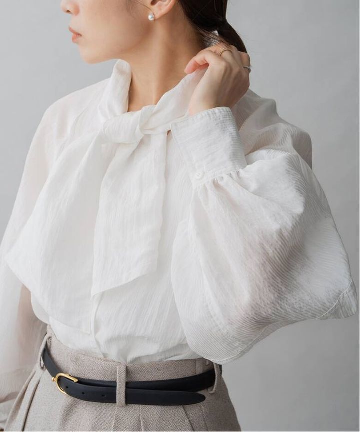 エアリーな生地感と、シャドーストライプのあしらいが華やか。ボリュームのある袖がエレガントさを演出してくれます。ふわりと軽やかなタイは取り外し可能。ボウタイの有無で印象がガラリと変わるので、お仕事シーンやカジュアルアイテム合わせのスタイルでも活躍しそう。