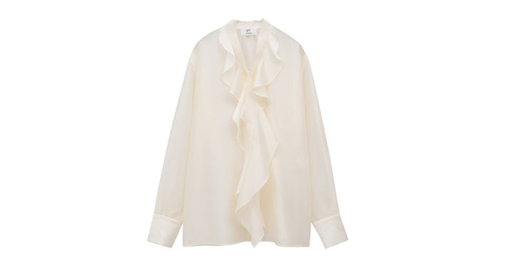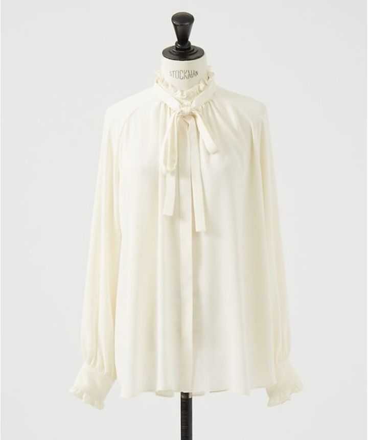 ボウタイのラッフルフリルと、品のある素材感で 最高に着映えるブラウス