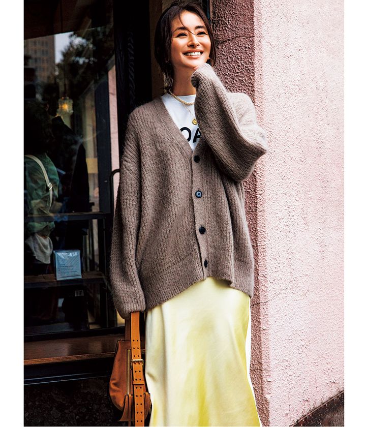 カーディガン¥46,200Tシャツ¥11,000(ともにスローン/ザ ショップ スローン 新静岡セノバ店)スカート¥16,500(アルページュストーリー)バッグ¥86,900(ラディカ スタジオ/アマン)ピアス¥48,400コインネックレス¥26,400パールネックレス¥69,300(すべてマリハ)