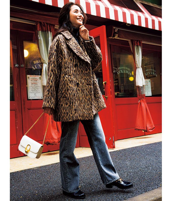 主張の強いレオパード柄は、コンサバ感を控えめに少しモードに着こなすと決まりやすいです。潔くアウターで取り入れて。
