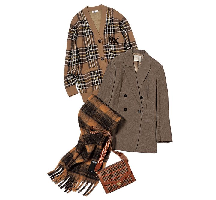 今季のブラウンは柄アイテムも豊富。主役級から無地感覚で合わせやすいものまで幅広く揃っています。ちょっと派手めな柄もブラウンベースなら、くどくならずに楽しめます。