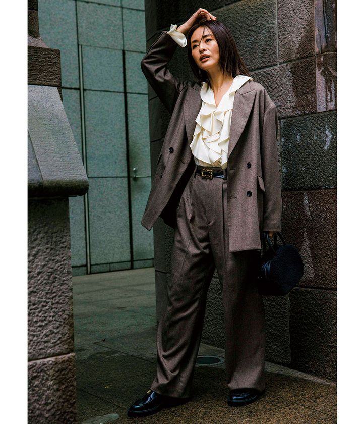 ジャケット¥58,300パンツ¥31,900(ともにHER.)ブラウス¥26,400(プルミエ アロンディスモン)バッグ¥13,200(ツル バイ マリコ オイカワ)ローファー¥19,800(ダイアナ/ダイアナ 銀座本店)ベルト¥26,400(ア ヴァケーション/ノーベルバ)