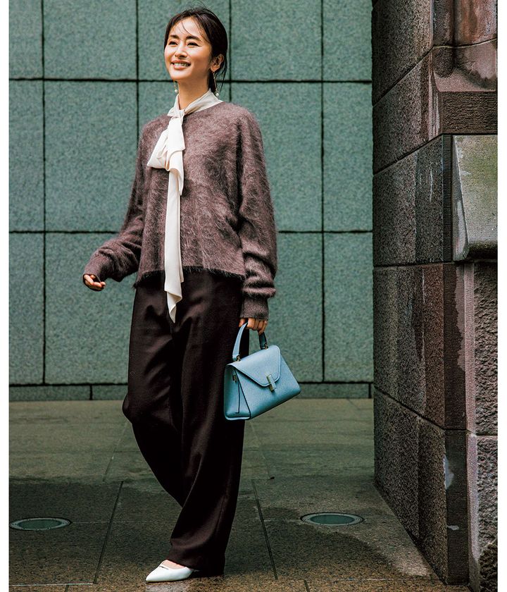 ニット¥69,300(カオス/カオス丸の内)ブラウス¥16,500(ノーブル/ノーブル 有楽町マルイ店)パンツ¥30,800(ニコラ ジェンソン/リノウン)バッグ¥572,000(ヴァレクストラ/ヴァレクストラ ジャパン)パンプス¥69,300(ペリーコ/アマン)ピアス¥9,900(ワンエーアールバイウノアエレ/ウノアエレ)リング¥97,900(リズリーク/ロードス)