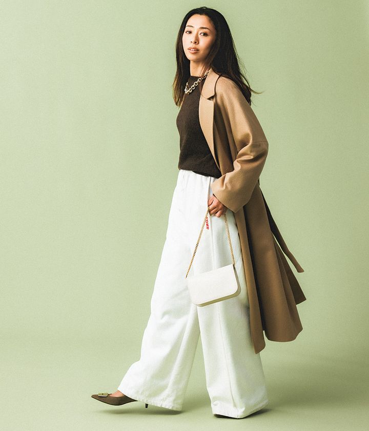 スウェットパンツ¥13,750(メゾンスペシャル/メゾンスペシャル 青山店)キャメルコート¥148,500(アルアバイル)ニット¥28,600(スローン/ザ ショップ スローン 神戸)バッグ¥69,300〈マエストソ〉パンプス¥82,500〈ペリーコ〉(ともにアマン)ネックレス¥13,200(アビステ)