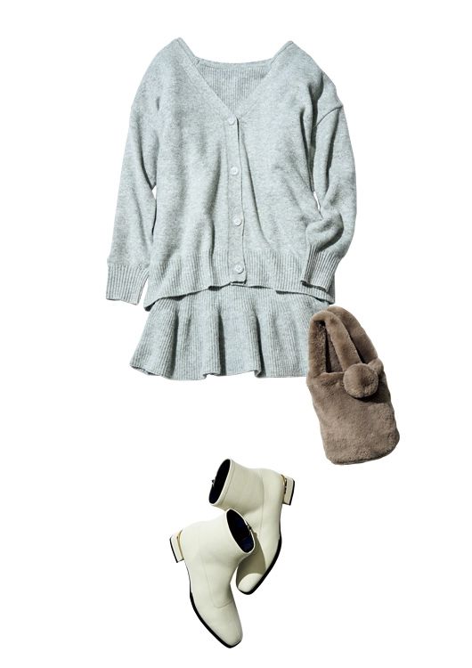 カーディガン×ミニワンピースセットアップ¥17,600/31 Sons de mode(ヒロタ) バッグ¥3,850/エスタ(ムーンバット) ブーツ¥37,400/銀座かねまつ(銀座かねまつ6丁目本店)