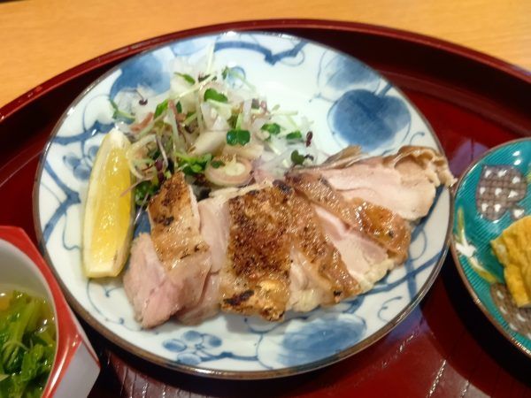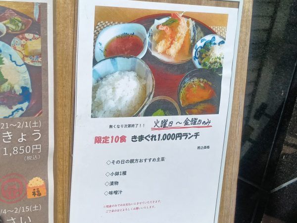 そして、この日のお目当てメニューが、火曜日〜金曜日のみ、10食限定の「気まぐれランチ」1,000円! 安っ!おすすめ主菜に、小鉢1種、漬物、味噌汁と定番ながらも充実したメニューです。(現金払いのみ)