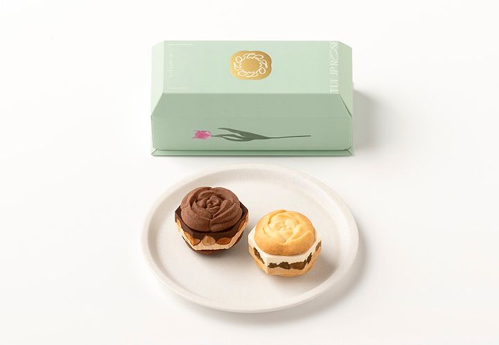 チューリップの花びらのように繊細で軽やかに焼き上げたラングドシャ生地は、芳醇な香りあふれるブルターニュ産発酵バターを使用。バラのように美しく絞ったショコラクリームは、クリーミーなコクのある北海道産ミルクで濃厚なおいしさに進化! フレーバーは「ミルクバター」と「チョコレート」の2種セットです。