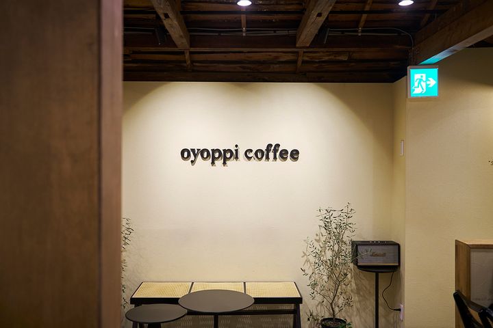 こちらは入口を入って右側にあるベンチ席。「oyoppi coffee」と店名のロゴが壁に描かれた畳風のベンチで、特別感のあるスペース。この席が空いていたらラッキー!