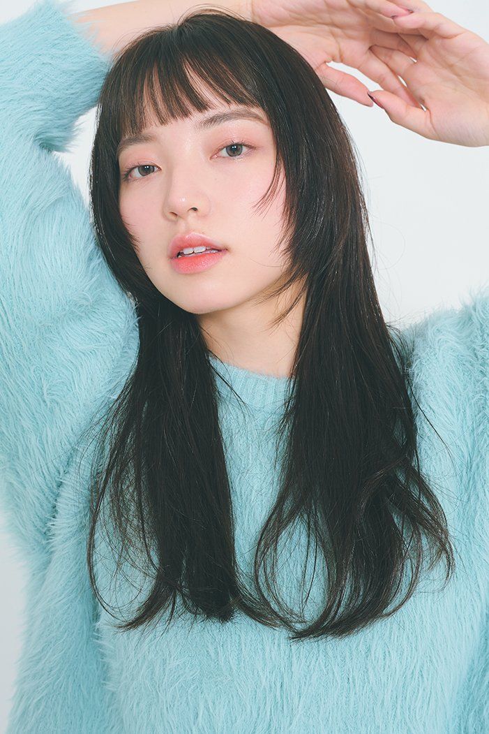 眉が見える長さで短めにカットした前髪と、頬骨をカバーする顔まわりの毛束の掛け合わせで、顔の出る面積を細長くしてスマートに。レイヤーをあえて顔まわりのみにすることで、首をすっきり見せる効果も。ダークトーンのカラーで髪と肌の白さとのコントラストができて、さらに引き締まった印象に。