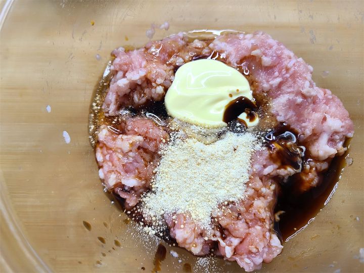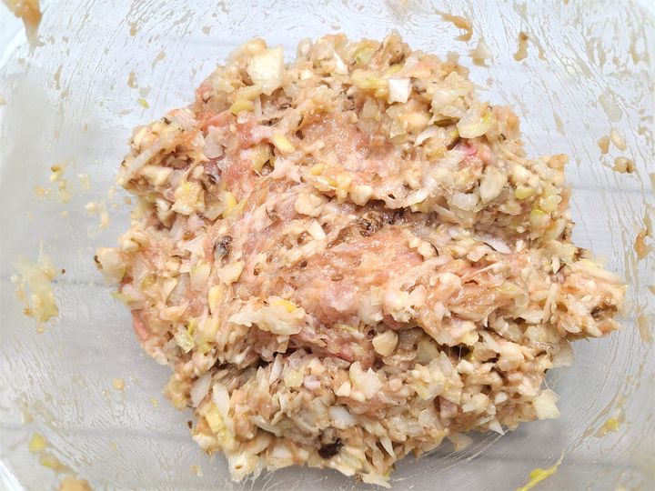 5. しょうゆ、オイスターソース、鶏ガラスープの素、マヨネーズ、ゴマ油、片栗粉を加えしっかりと混ぜ合わせたあと、1の長ねぎ、しいたけ、しょうがを加えてふわっと混ぜ合わせます。