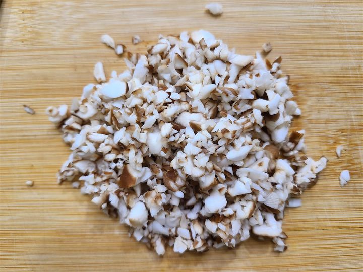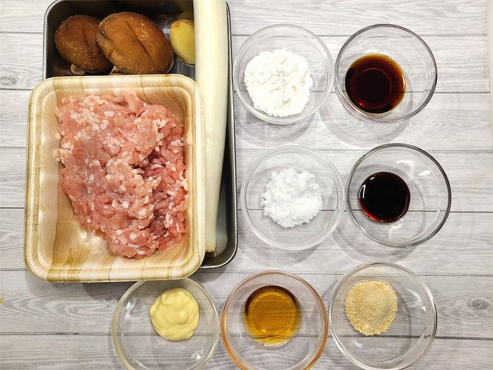 1. しいたけ、長ねぎ、皮を剥いたしょうがをみじん切りにします。しいたけは軸も先端を落とした後、みじん切りにします。