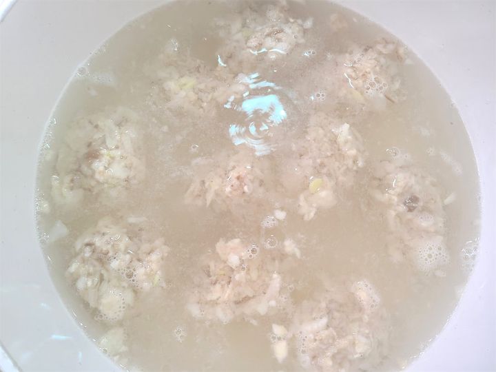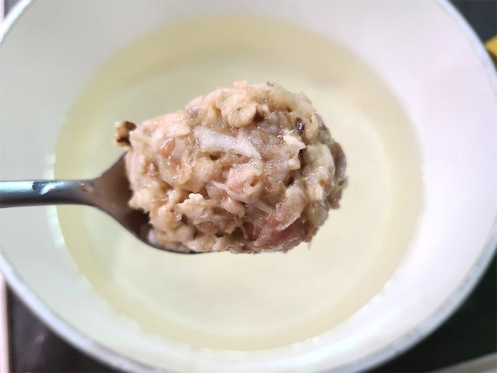 6. 鍋に水、みりん、白だしを加えて中火にかけ沸騰させ、5をスプーンなどを使ってすくい入れていきます。お好みの大きさでOKです。わたしは10個のつくねができましたよ!全部入れたら弱火にして3分ほど煮込みます。