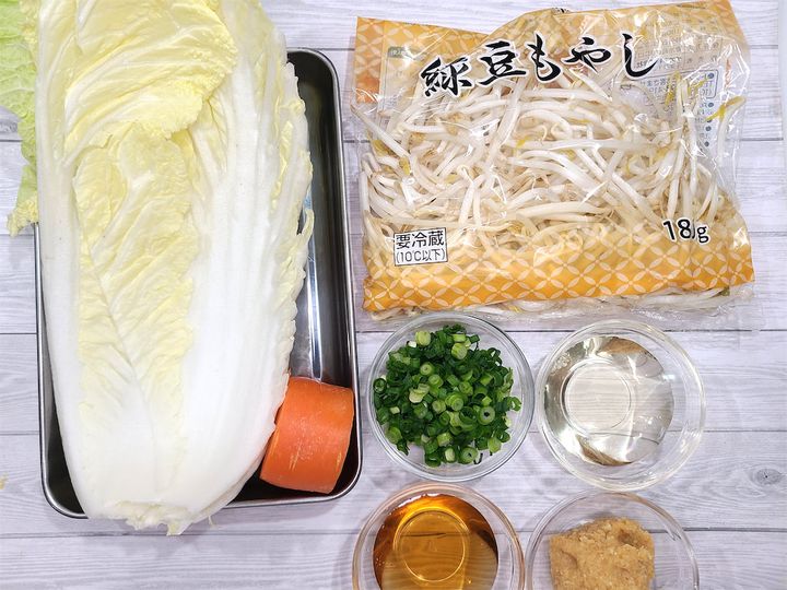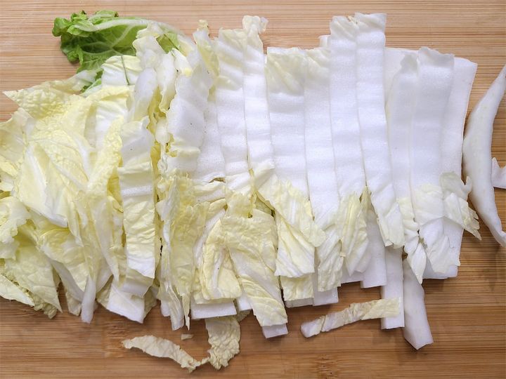 2. 白菜は根元を切り落とし、1cm幅に切り、もやしと一緒に水洗いします。