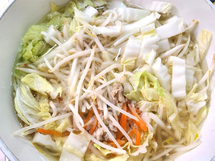 7. 2の白菜、もやしと3のにんじんを入れよく混ぜ、中火にして一度沸騰させます。沸騰したら弱火にしてフタをして10分ほど煮込みます。
