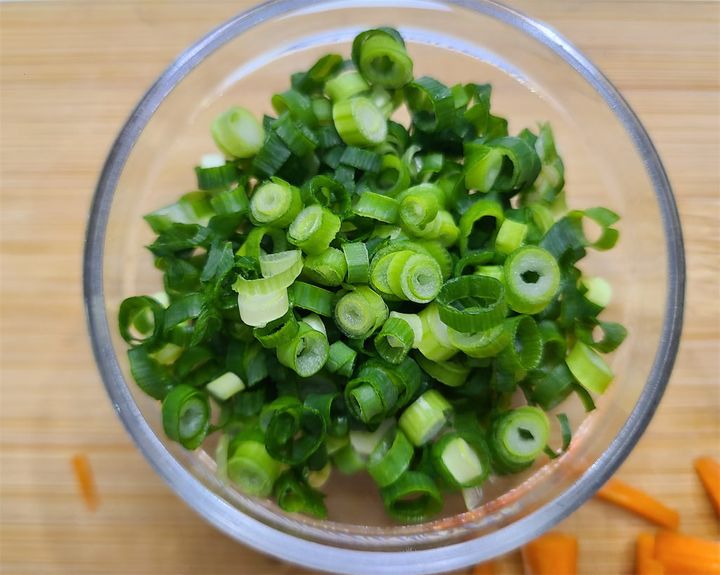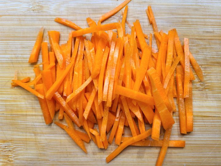 3. にんじんは皮を剥き薄切りにしたあと、縦に細切りにします。青ねぎは小口切りにしておきます。