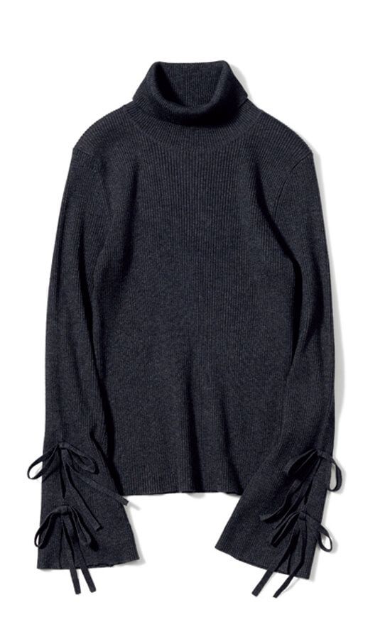 袖に飾った華奢リボンが大人フェミニン♡ どんな色ともなじませやすいニュアンスグレー。タートルネックでスタイリッシュに。