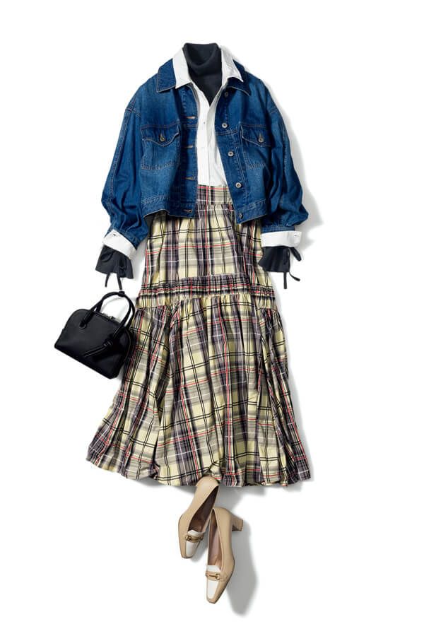 ニット¥13,200/アプワイザー•リッシェ Gジャン¥18,700、シャツ¥19,800/ともにアルページュ ストーリー スカート¥17,930/LILY BROWN バッグ¥48,400/VASIC(ヴァジックジャパン) 靴¥33,000/銀座かねまつ(銀座かねまつ6丁目本店)