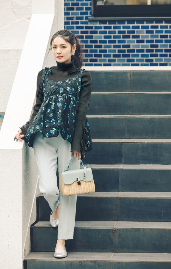 [ニットソーを着回し]キャミ¥16,940/LILY BROWN パンツ¥14,960/INDIVI(ワールド プレスインフォメーション) イヤリング¥3,610/エルワイナウ(ロードス) バッグ¥44,000/銀座かねまつ(銀座かねまつ6丁目本店) 靴¥15,960/ダイアナ ウェルフィット(ダイアナ 銀座本店)