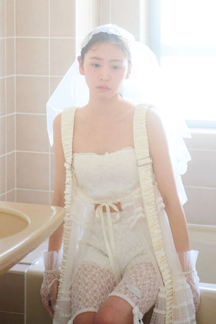 白チュールフリルワンピース 11,880円/AS KNOW AS PINKY レースショートパンツ 11,000円/Candy Stripper ハートリング 6,800円/TUWAKRIM(805showroom)ベアトップ、ヴェール、グローブ/以上スタイリスト私物