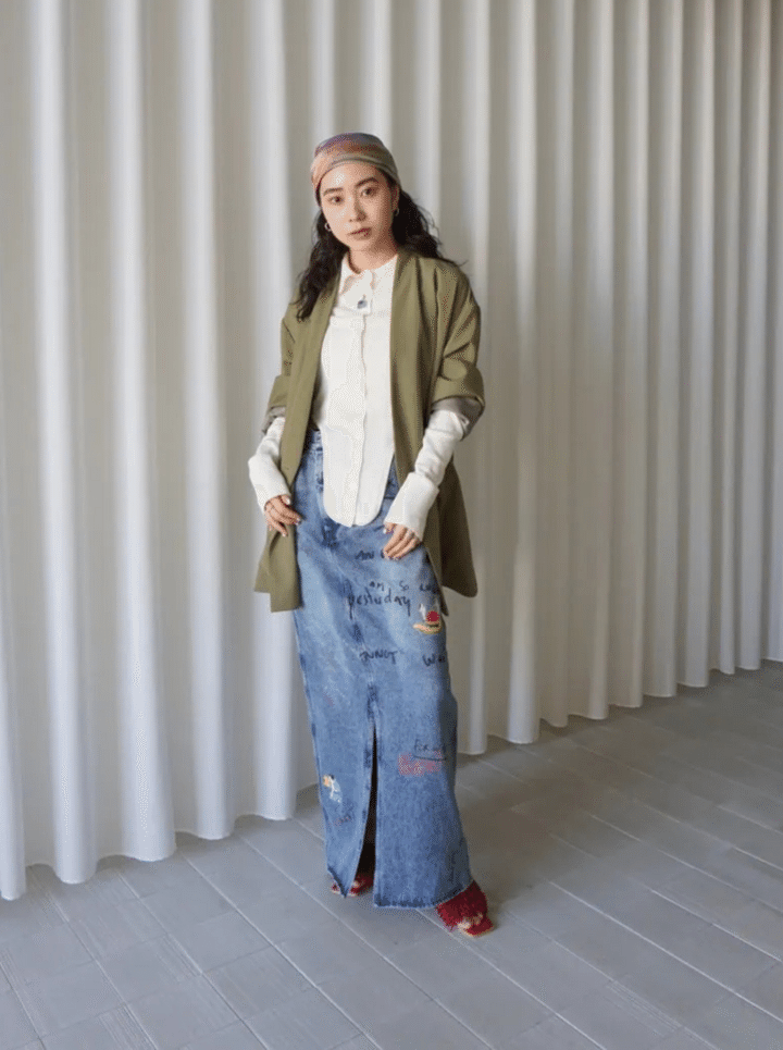 「シンプルでキレイめシルエットのジャケットは、カーキ色なのでほどよくカジュアルに着こなせる一枚。ヴィンテージライクなスカートとも相性抜群です。ジャケットとセットのスカーフは頭に巻いてスタイリングのポイントにしました」