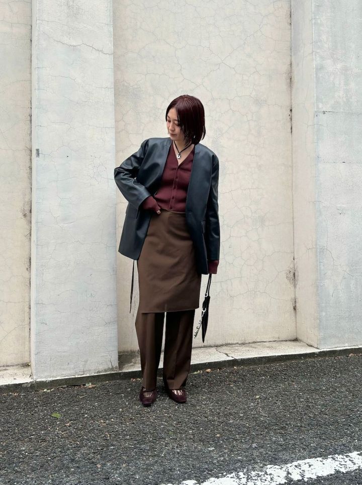 「この春、まず初めに購入したMIESROHEの“洗える”レザージャケットを主役にしました。ありそうでないノーカラーのオーバーサイズでシルエットが美しいのもポイント! 今までグレーを合わせがちでしたが、今季気分のブラウンをボトムにチョイス。カラーを変えるだけで、新鮮かつ女度が上がって見える気がします」