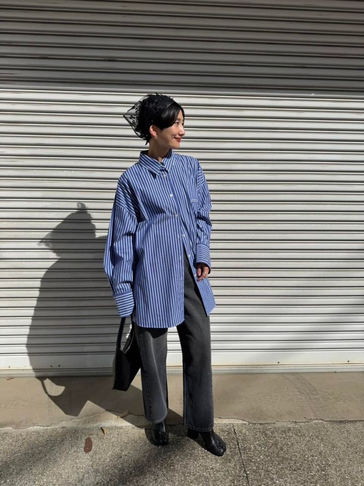 「もともとシャツが大好きなのですが、今シーズンは特にストライプが気になりプロヴォークのものを購入しました。ビッグシルエットなので、その分ボトムをデニムにすることでスッキリまとめています。シャツは裾のボタンをあけて動きのあるコーディネートにし、バッグやシューズは黒でまとめてメリハリをつけました。ストライプ×レースの組み合わせが好きなので、昨年購入したレースのバブーシュカをショートヘアのアクセントとして取り入れています」