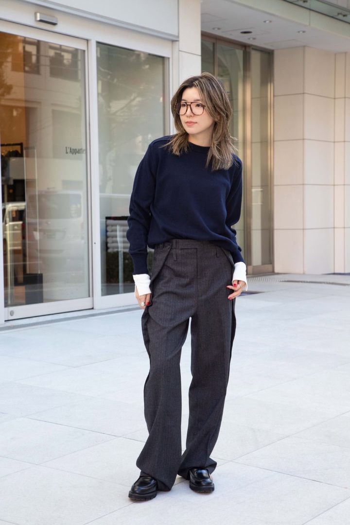 「デットストックの生地を使用したデザイン性の高いBETTTER(ベター)のパンツを主役に。他はシンプルなニットやローファーを合わせて、ハンサムなコーディネートに仕上げました。ネックレスは着けない代わりに、眼鏡で顔まわりをドレスアップしています」